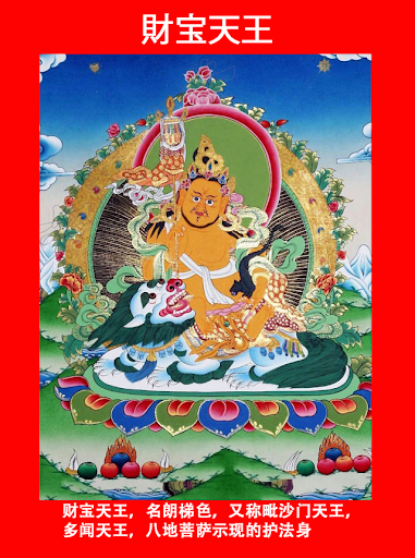 财宝天王,名朗梯色,又称毗沙门天王,多闻天王。是毗沙门天王变化身之一,他是八地菩萨示现的护法身,也是北方多宝佛的化现,作为财神护法,以出世间护法身份之示现。他身居金刚手菩萨的净土——北方柳叶宫,与金刚手菩萨有颇深的渊源,属于金刚手菩萨的部属。其具有大福德,专门保护众生的财富,是世上一切财富的守护者,是掌管财宝富贵、护持佛法的善神。