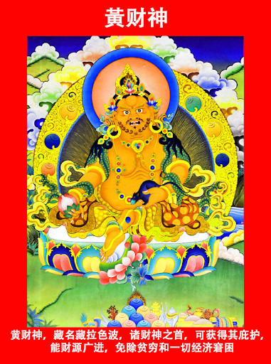 黄财神为北方司财众部之首领,掌无尽宝库,修此法者,可消灭六道穷苦,增长福德、寿命、智慧, 以及一切物质与精神上的受用。心灵上得到满足。