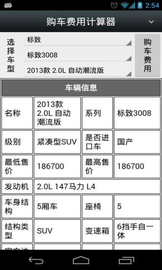 通过《购车费用计算器》不仅可以计算出所选车型的具体价格,还可以查询详细的明细付费项目,保险金额,厂家指导价,最高售价,最低售价,贷款购车详细金额。购车费用计算器还提供丰富的车系车型信息查询,动力系统,车身大小,车型配置等信息。