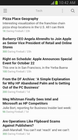 feedly 是一款 Google Reader 阅读器,无需繁琐的自己添加各种 RSS Feed,只需要输入你的 Google Reader 帐号(就是Gmail邮件帐号),就可以直接进行绑定,自动导入其中所有订阅,同时内置各种知名rss源。