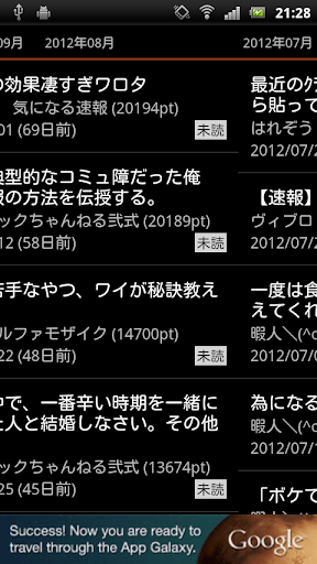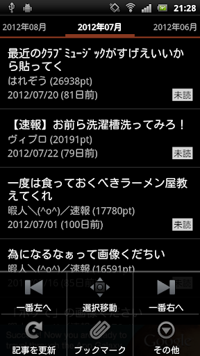2chまとめサイトの過去の人気記事一覧アーカイブを期間別にタブ形式で表示します。期間別の記事一覧はスワイプ動作でページ送りしてチェックできます。一覧から気になる記事をタップすることで、2ちゃんねるまとめサイト・アンテナサイトの記事を読むことができます。内部ブラウザで最適化して表示します。無料です。過去の記事は2chまとめの黎明期である2005年12月からあります。電車の移動中などの暇つぶしにどうぞ。