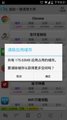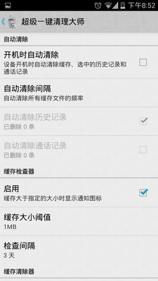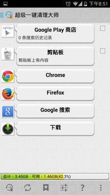 (一键清理)能帮助您一键清除所有的缓存/历史记录/通话记录/默认设置,使用一键清理,您就能通过清除应用缓存文件、数据文件、搜索/导航历史记录或通话和信息记录来获得更多的设备内部存储空间。