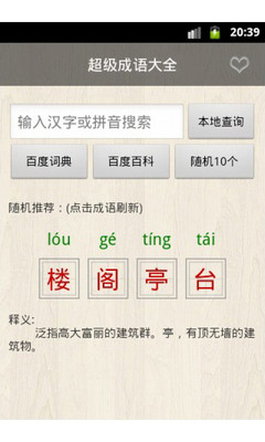 《超级成语大全》收录了3万多个成语,是目前安卓应用中包含成语量最大最完善的成语词典;每条成语带有拼音、释义、出处和造句示例,是一本非常方便的成语查询应用,软件使用完全免费,不做任何收费限制,纯粹是为了方便各位师生学者平时学习使用,感谢大家的支持!