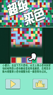 这是一款完全免费的小游戏,小巧有趣,操作简单,容易上手,看似简单,其实不然。游戏画面十分简单,从左上角的色块开始,将所有色块染成同一颜色,就算赢。不过光赢还不算要看谁用的时间少步数少才算牛哦。