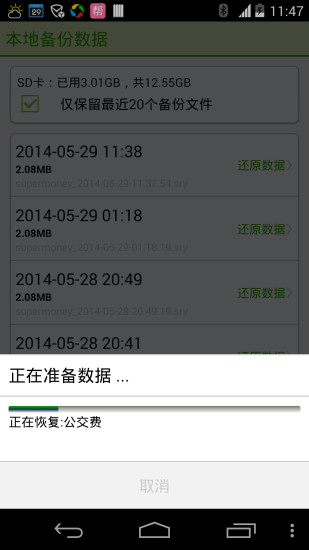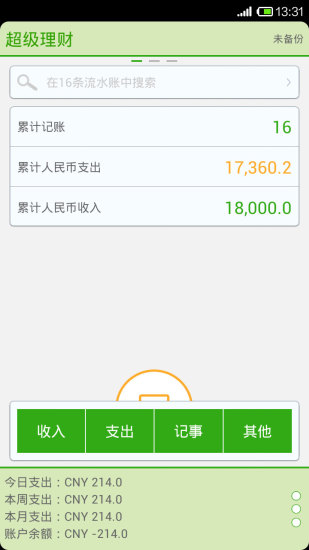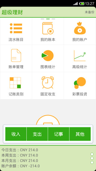超级理财(Supermoney)是一款方便实用的支持多币种、分账本记账的个人理财软件,定期生成账单,简单统计,导入导出记账。支持导入淘宝交易记录。定期自动备份数据。时刻掌控自己的金钱流向,是个人理财、挖财、省钱、随手记账的实用助手。上班途中,地铁上、公交上...抽出5分钟整理一下消费、支出,既打发了时间,又掌控了资金流向,何乐而不为。 支持简、繁体、英文(超级理财) 关键字:理财、挖财、挖财、随手记账、个人理财、银行、supermoney、 超级理财、超级、记账、账单、财务短信、汇率查询、汇率、流动资金、固定收支、数据备份、淘宝、淘宝交易、交易、财产、多账本、提醒、手机花费、银行还贷、信用卡、工资、转账、差旅、借出、借入、归还、新浪、微盘、工资查询、快速记账、彩票、记账模板、招财、招财猫、切糕、随手、随时、jizhang、licai、理财日历、日记、定时记账、循环、闹钟、提醒