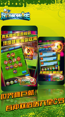 最爽、最快、最容易、最火爆的足球手机游戏!让你手指根本停不下来!世界杯实时赛事竞猜全新登场,《足球先生》让你大腕球星附体,五大联赛、竞技场、地下球赛、实时重点赛事竞猜!尽情享受激情澎湃的世界杯盛宴!豪华阵容任你的调遣!掌控顶级足球赛事, 3分钟就能爽一把。小伙伴们还等什么呢?足球要爽、你就上!现在登录激活首冲翻倍,加送2013年度足球先生六星C罗。