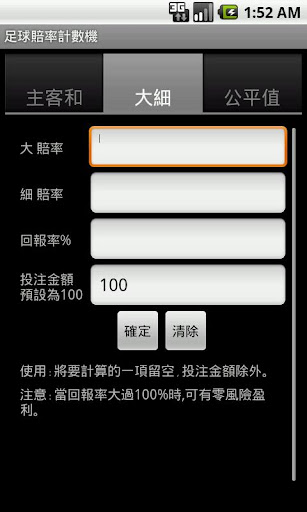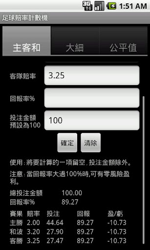 足球賠率計數機v1.1主要讓用戶對庄家開出的賠率有一定的認識,用戶可以透過回報率比較不同庄家的邊際利潤,選擇對自己最有利的賠率下注. 簡單而言,回報率越高,代表對賭客越有利.當回報率大過100%時,無論什麼賽果,賭客可有零風險的盈利. 也可應用在有即時投注的賽事,在不同時段下注作風險對衝.