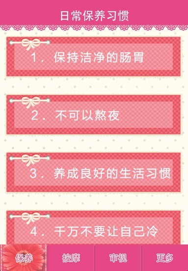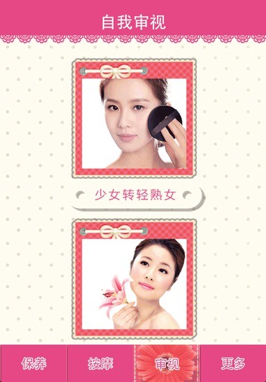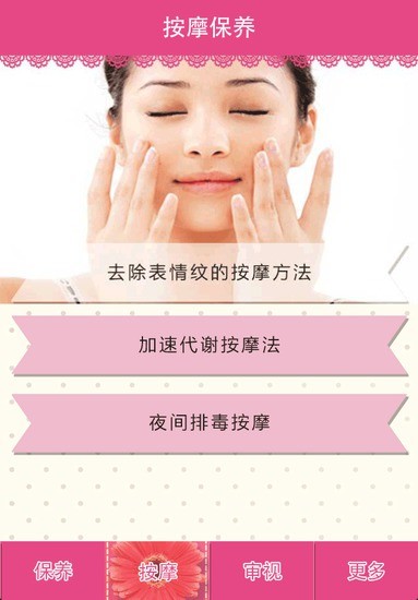 这款应用集合了如何保养、如何调整日常生活习惯,和去除皱纹等保养的按摩手法,助你有效对抗时间这把杀猪刀,让你保持青春!!!