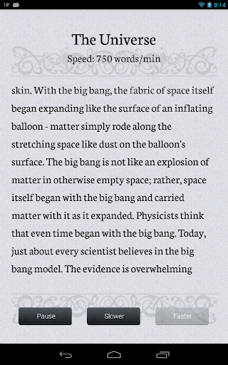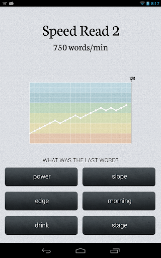 應用程序將幫助你擺脫壞閱讀習慣,比如回歸(重新讀字)和分發聲(沉默聲樂加工,而讀)。 在同一時間,你將制定一些速讀技巧,你可能不知道你是腦部的學習能力。 這些措施包括:掃描的話,跳步驟,是最佳的讀、塊讀(認識到多個Word,而不把你的眼睛)和員額-visual讀(確認的話,你的眼睛彩票過去他們)。