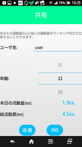 アプリは、クラウドサービス[※1]に対応しており、ご自身と他の利用者群のEx(エクササイズ)が比較できます[※2]。日々の身体活動のモチベーションの維持にご活用ください。