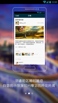 邻通是一款服务以业主交流、相互帮助、物业通知、业主论坛、城市手机论坛等服务为主的手机软件,您想知道你楼上楼下住的是谁吗?想认识她们吗?那请赶快下载吧!