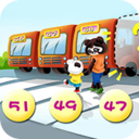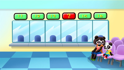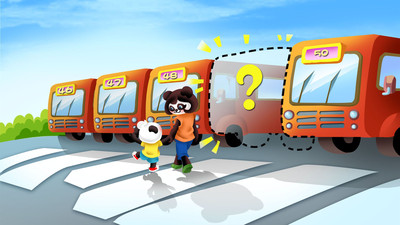 小朋友,大家都来数一数吧。天天和妈妈一块坐电梯,有一个按钮的数字掉了,帮天天把问号处的数字找出来吧。天天和妈妈来到一排公交车前面,其中的一辆车开走了,你知道哪辆公共汽车开走了吗?
