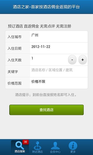 酒店之家全国数万酒店无需登录即可低价预订,高额返佣无需点评即可提现,更有10元额外奖励![酒店之家]是国内首家全返佣金的预订平台,全国数万家酒店无需登录即可低价预订,高额返佣无需点评即可提现,更有10元额外奖励!酒店之家提供酒店智能搜索,实拍酒店图片,真实客人点评,酒店地图查询,酒店详情一清二楚.在线预订,到店支付,酒店之家最您居家旅行,出差度假,必备的好帮手!感谢您支持酒店之家,使用中有任何问题均可通过以下方式进行反馈:合作联系邮箱:webmaster@hotelhotel.cn网站:www.hotelhotel.cn新浪微博:请关注@酒店之家