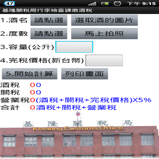 身為一個行李檢查員,有了這個app就可以快速計算出,旅客攜帶超量的酒所要付的關稅、酒稅、營業稅為多少。還可以自己新增酒的種類及其稅率,並可以輸入旅客資料進行列印(透過截取瑩幕畫面)
