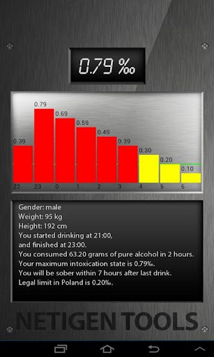 •計算 - 通過選擇你喝的酒的種類和數量,你可以找出多少陶醉你,當理論上你將有足夠的清醒依法選定的國家開車。設置您的性別,體重,身高和在此時間什麼時候開始和停止飲用。最佳呼氣會計算你的最大的中毒狀態,並告知在此時間你會在理論上的清醒。