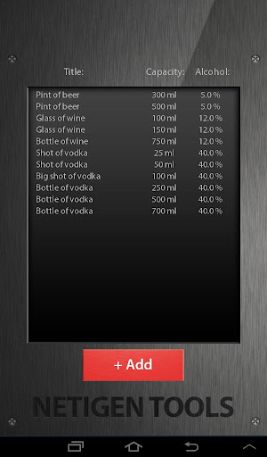 •酒精類型 - 您可以通過在適當的框中鍵入其名稱,容量毫升,並以百分比的酒精含量增加新類型的酒精。