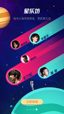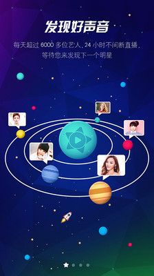 酷狗繁星在线视频互动演艺平台,每天超过6000多位艺人、歌手、网络好声音,24小时在线不断直播。高质量的视频画面,Live现场音效感知,千万音乐爱好者在线狂欢,与艺人零距离互动,让您随时随地享受演唱会超high气氛。还有大咖艺人的直播互动类访谈节目——星乐坊,丰富多彩的直播互动访谈模式,让百万粉丝通过互联网,近距离接触访谈现场。