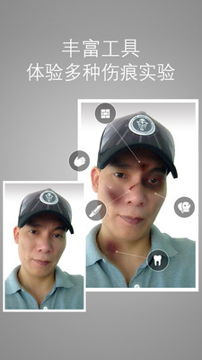 选取菜单内的打击工具及力度,点触图像,随即就会在图像上显示对应“伤痕”,及产生打击音效。随即可通过触屏方式对“伤痕”进行旋转、缩放等功能,取得真实得意想不到的伤痕效果!