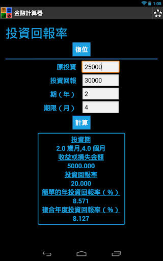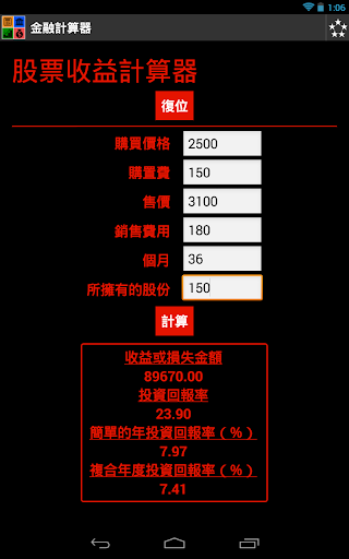 股票收益計算器用於計算利潤/虧損,投資率回報的基礎上幾個月,購買和出售股份,其費用。