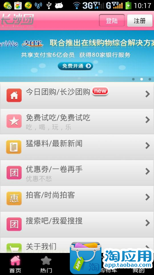 长沙团购客户端是长沙团购网(www.changshatuan.com)为手机用户推出的免费团购导航应用,每日为您精选上千家长沙团购网站的信息。具有团购信息分类浏览,搜索等贴心功能,为您带来方便快捷的手机团购体验。