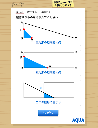 このアプリは中学3年生の「関数y=ax2の利用(その2)」が学べるアプリです。「AQUAアクア」シリーズの全アプリを簡単に呼び出すことができる「総合メニュー」を合わせてご利用いただくと便利です。