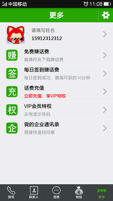 中心,免费赚话费、签到赚话费、话费充值、会员特权。