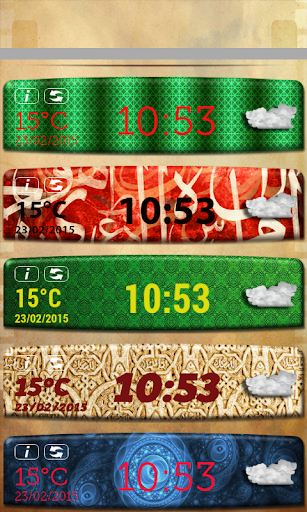 應用這些伊斯蘭部件很容易,非常適合給你的屏幕上瞬間的精神伊斯蘭的樣子。獲取☀阿拉伯語 時鍾天氣預報微件☀並顯示您的奉獻給真主。有了這些美麗的免費數字時鐘,你將體驗到你的屏幕完全嶄新的面貌。等待沒有更多,請瀏覽該顯示天氣的溫度令人難以置信的時鐘!時鐘顯示在攝氏和華氏溫度!獲取這些獨特的時鐘自由和享受的冬季天氣或夏季天氣阿拉伯語“天氣小工具”。