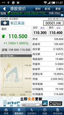 "AAStocks 掌上财经是AASTOCKS 网站的手机客户端软件。AASTOCKS 是香港NO.1专业财经网站,全港最具权威的股市资讯分析平台及解决方案供应商,一直深受投资者欢迎。根据Nielsen Online SiteCensus提供的浏览量数据显示,AASTOCKS浏览量一直为全港金融网站之冠。 AASTOCKS现推出Android程序,为用户带来最全面的香港股票市场资讯及多功能分析服务,让用户可随时随地直击最新市况及动向,捕捉投资先机。