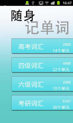 还在为高考英语词汇苦恼吗?四六级 or 考研?NO NO NO,这一切将不再成为问题,我们为正在英语词汇战场上苦战的您量身定做了这款记单词的应用,小巧的身躯却有着强大的能量。汇集了各大网站各大词典海量的单词,大量通俗易记的精美句子,拥有独家的记忆方法,加上科学的测试方式,让您随时随地拿起手机就能记单词,随时提升词汇量!我们力求简单、方便、实用,这款《随身记单词》全然是为了记单词而生!