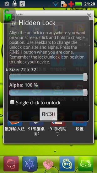 这款软件可以在桌面设置隐藏图标,在解锁桌面的时候只有点击图标才可以彻底解锁屏幕,可以很好的保护你手机里的信息。