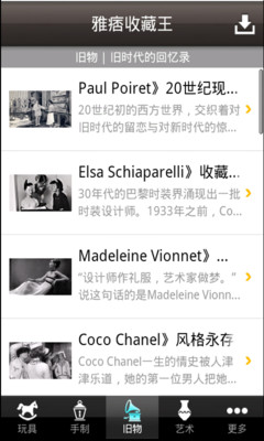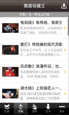 雅痞指的是年龄在30-45之间,受过高等教育,住在大都市,有较高的社会背景与地位,工作勤奋,追求较高的物质享受,衣食住行一律求名牌、赶时髦,并且思想前卫、踌躇满志的人士。讲究生活品质、时尚、思想前卫的Yuppie(雅痞),有一定的经济条件去满足自己喜好的收藏。本支app就是针对雅痞这个族群,介绍雅痞族的经典收藏品,并且从这些经典收藏品带出其隐含的文化背景与生活方式
