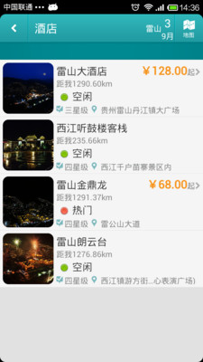 雷山旅游指南是一款发布贵州省雷山市旅游相关信息的应用,发布内容包括雷山市相关酒店、商场、农家乐、旅行社等信息。可以通过该应用与以上先关旅游企业进行网上预订服务。
