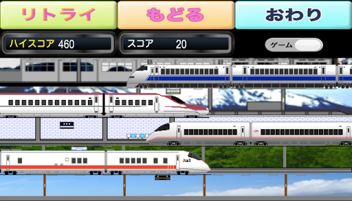 画面に現れる新幹線をタップするゲームです。タップすることで画面上から新幹線が消え、スコアが入ります。