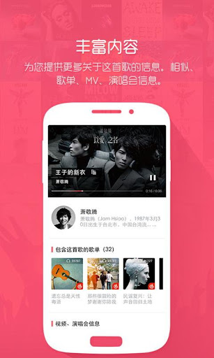 听歌识曲,哼唱搜歌,立刻给你想要。无论是突然听到的好音乐,还是儿时记忆中朦胧的曲调,我们都能为你搜到。全球最大曲库支持,世界音乐检索评测(MIREX)识别率冠军,专利算法极速识别。