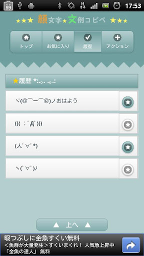 気に入った顔文字や文例をタップすると、クリップボードにコピーされます。