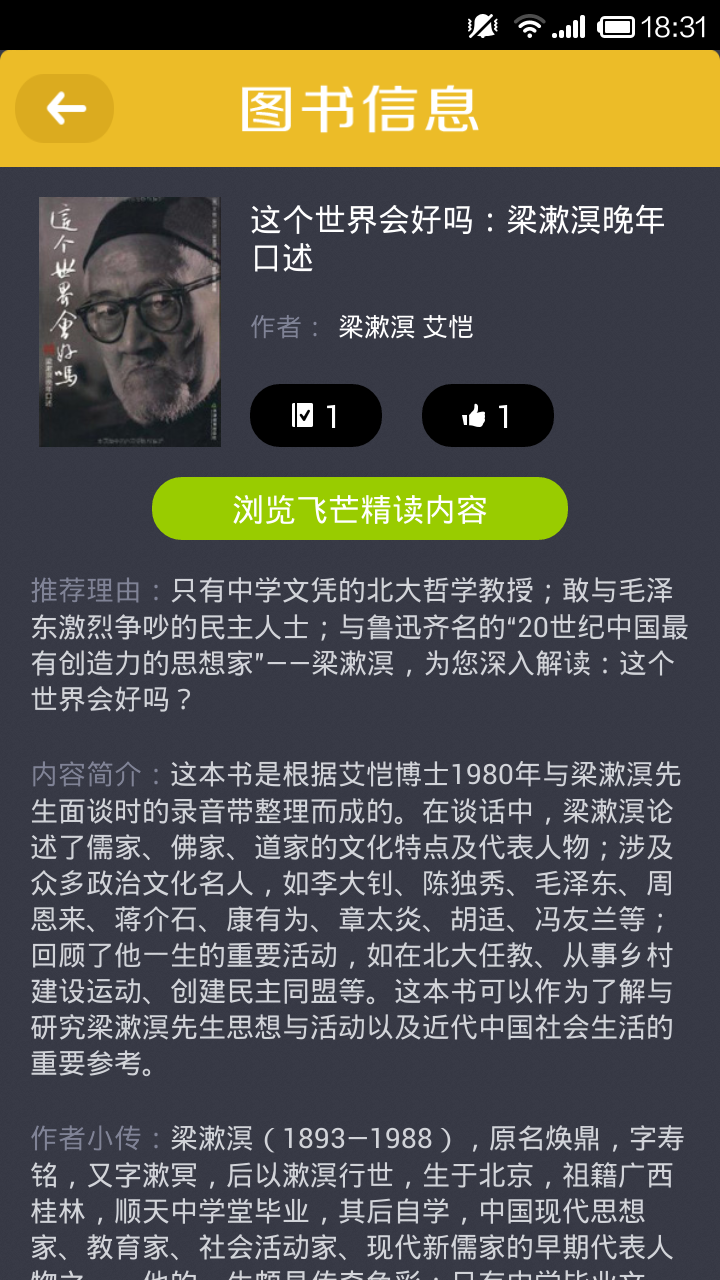 飞芒君就是要帮你“多、快、好、省”的读书、选书,快速了解一本书的精髓,快速掌握最新图书资讯。同时,将家中的藏书一机掌握,只需扫描图书条形码,将自动识别图书信息,生成你的个人线上图书目录。
