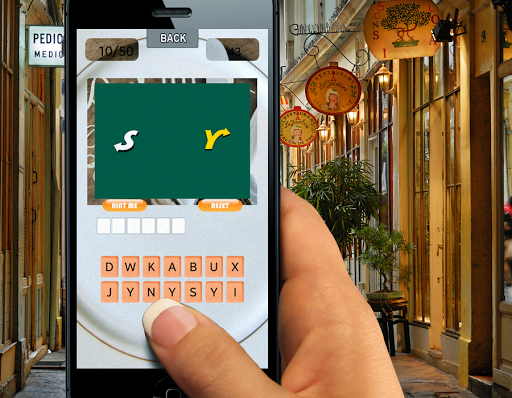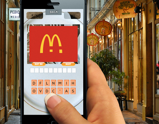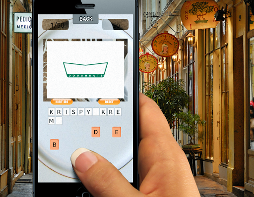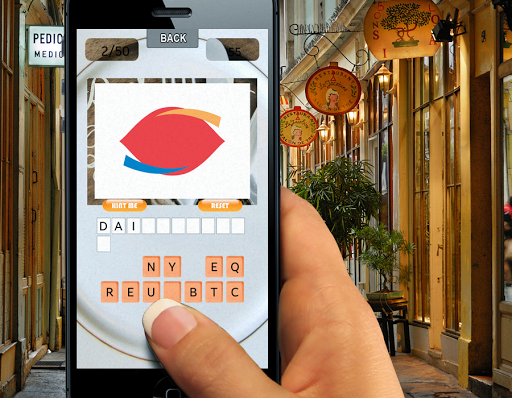 按下图象的散射字母排列著作权或餐厅中的图片的商标名称。小心丢失的拼写,你可能会失去硬币分数,可用于交换的线索或暗示。