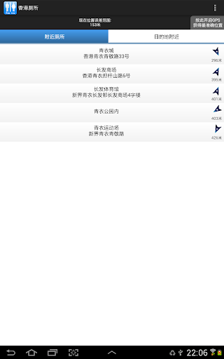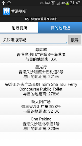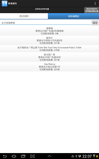 包含香港1500个厕所位置,可以提供最近厕所位置,并能搜寻目的地附近厕所。当中包括公共厕所,商场,体育馆,公园,运动场,图书馆,足球场,篮球场,以及不同公共设施附近的厕所位置。