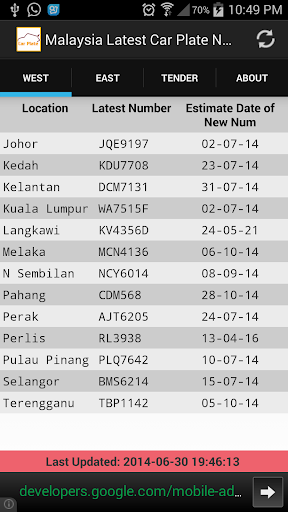 此应用程序允许用户查询马来西亚最新车牌号码,尤其是车主想要购买新车或注册车辆的车牌号码时候,能查一查最近的号码。