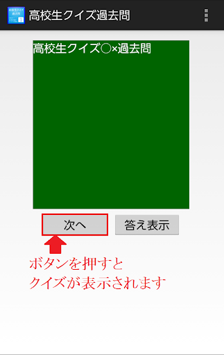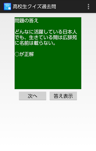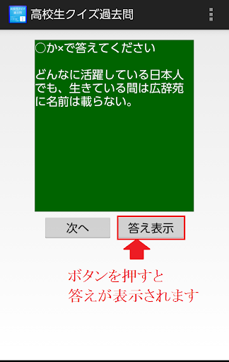 高校生クイズ(全国高等学校クイズ選手権)の過去問題集です。今回は1回戦で出題された○×問題を集録しました。これから高校生クイズに出演してみようと思っている人やクイズ好きの皆さん、雑学好きな人などお楽しみいただけると思います。クイズはランダムに出題されます。この無料アプリの使い方は誰でも感覚で使えるようにとてもシンプルに作りました。ボタンも2個しかなく「次へ」ボタンを押すとクイズがランダムに出題されます。「答え表示」ボタンを押すと答えが表示されます。1回戦で出題されるクイズは2択で○×問題なのでアプリで出題される問題を見て頭の中で○か×を答えるだけ!とてもシンプルな無料アプリです。高校生クイズの問題は雑学としてもとてもためになるので大人の方もじゅうぶん楽しめるクイズとなっておりますので是非ご使用下さい。