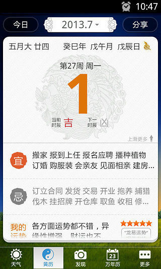 千万用户的选择,众多电子市场装机必备软件。 黄历天气是国内首款完美结合天气与黄历功能的免费查天气软件,其特点是黄历专业、天气准确、覆盖城市广、省流量、界面精美、预警贴心提醒,支持实时播报中国主要城市的空气污染指数,提供美使馆与环保部的PM2.5权威监测数据。软件自发布以来,已经成为超过8千万用户的共同选择,是众多电子市场推荐的装机必备软件。