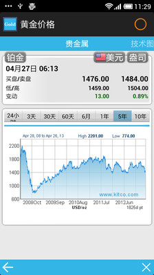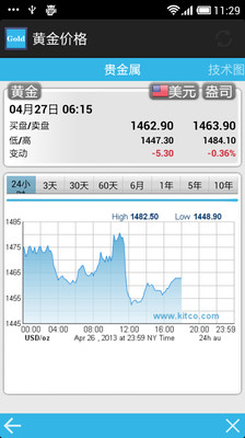 实时黄金价格查询,如果你是黄金投资者,这绝对是你的必备应用。支持黄金,白银,铂金,钯金4种贵金属实时价格,走势图。包括24小时,3天,30天,60天,6个月,一年,两年,5年,10年等各种技术图。支持13种货币实时汇率换算。