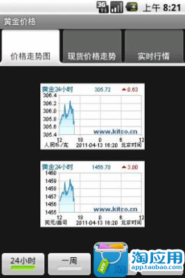 用于查看黄金价格,以人民币或美元为单位显示24小时、一周、30天、一年的黄金价格走势与现货价格走势。本软件精致小巧,使用时占用流量低,并且不带广告!近期的更改:V1.6.1修复“实时行情”不刷新的BUG。V1.61、新增黄金现货价格走势,图片大,看得更清楚。2、新增文本行情,流量极低,速度快。3、优化程序性能,界面更流畅,加载速度更快。V1.51、增加以一周为单位的黄金价格走势图。2、增加设置菜单,允许自定义设置是否显示“人民币/克”的价格走势图与“美元/盎司”为价格走势图,以控制网络流量。3、修正加载数据时无法退出的BUG。V1.41、增加以人民币与美元为单位的切换菜单。2、修正退出时出现的错误。