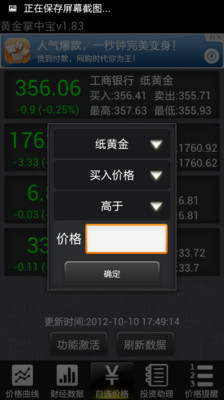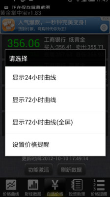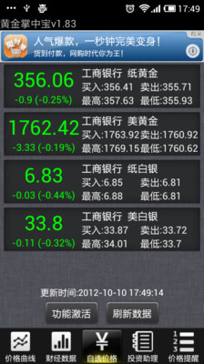 能够查看工商银行纸黄金、纸白银、纸铂金、纸钯金实时报价、曲线,显示价格快速、准确。可设置实时更新且消耗流量极小(每次刷新1k以内)。