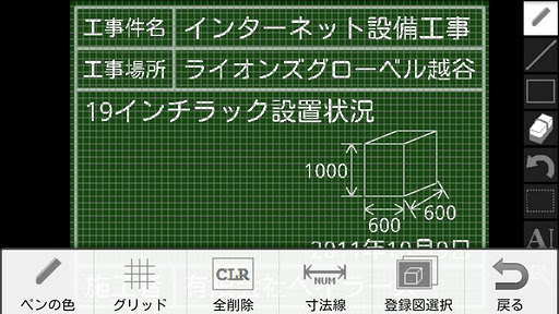 自由線・直線・矩形・消去・Undo・選択(移動・コピー・削除・図形登録)・文字入力・設定