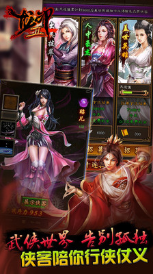 2、特色侠客:闯荡江湖,怎能没有侠客相伴。玩家可以通过多种途径获得侠客,对于多余的侠客还可以进行炼化获得魂魄,以换取顶级侠客。顶级侠客拥有专属神器,能让你的侠客更加强大!