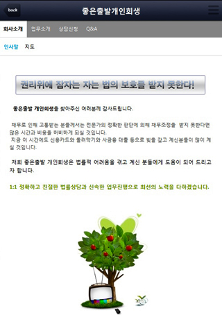 어플리케이션을 통해서 간단한 회사소개와 좋은출발 개인회생에서 진행하는 업무, 간단한 법률지식, 자문상담 등을 소개받으실 수 있습니다.