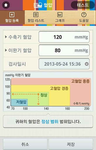 - 혈압을 기록관리하고 누적된 혈압결과를 그래프로 보여주어 혈압변화를 평가하는 메뉴입니다.
