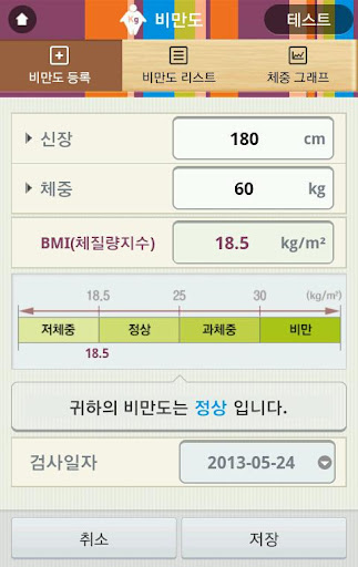 - 키, 몸무게를 기록하여 비만도, 체질량지수(BMI)를 산출하고 체중변화를 그래프로 보는 메뉴입니다.