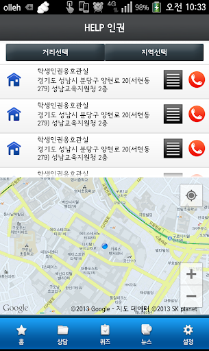 4. HELP인권 - 생활인권지원센터, wee센터, 학생인권옹호관, 117학교폭력신고센터, 경기에듀콜센터 등 상담기관에 대한 안내, 위치확인, 전화연결 서비스 실시